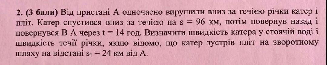 ДАЮ 25 БАЛІВ. Вiд пристані А одночасно вирушили вниз за течією річки катер пліт. Катер спустився вниз за течією на s = 96 км, потім повернув назад і повернувся В А через t = 14 год. Визначити швидкість катера у стоячій воді і швидкість течії річки, якщо відомо, що катер зустрів пліт на зворотному шляху на відстанi s = 24 км від А.