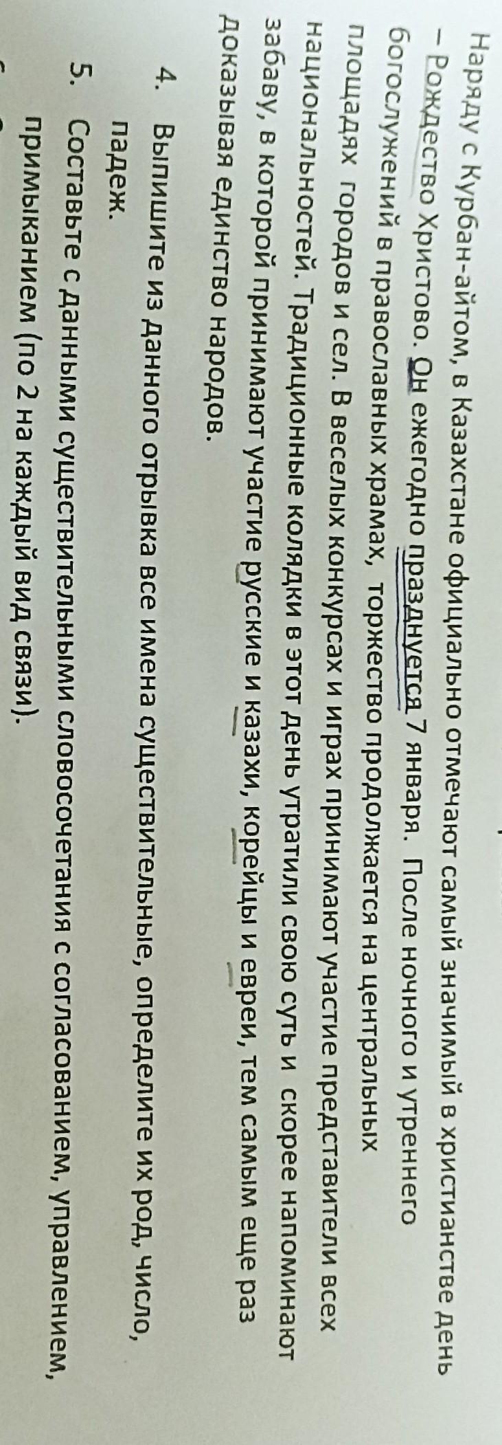 Наряду с Курбан-айтом (м.р., ед.ч., Т.п.), в Казахстане (м.р., ед.ч., П.п.) официально отмечают самый значимый в христианстве (ср.р., ед.ч., П.п.) день (м.р., ед.ч., И.п.) - Рождество (ср.р., ед.ч., И.п.) Христово. Он ежегодно празднуется 7 января (м.р., ед.ч., Р.п.). После ночного и утреннего богослужения (ср.р., ед.ч., Р.п.) в православных храмах (м.р., мн.ч., П.п.), торжество (ср.р., ед.ч., И.п.) продолжается на центральных площадях (ж.р., мн.ч., П.п.) городов (м.р., мн.ч., Р.п.) и сёл (ср.р., мн.ч., Р.п.). В весёлых конкурсах (м.р., мн.ч., П.п.) и играх (ж.р., мн.ч., П.п.) принимают участие представители (м.р., мн.ч., И.п.) всех национальностей (ж.р., мн.ч., Р.п.). Традиционные колядки (мн.ч., И.п.) в этот день (м.р., ед.ч., В.п.) утратили свою суть (ж.р., ед.ч., В.п.) и скорее напоминают забаву (ж.р., ед.ч., В.п.), в которой принимают участие русские (мн.ч., И.п.), казахи (мн.ч., И.п.), корейцы (мн.ч., И.п.) и евреи (мн.ч., И.п.), тем самым ещё раз доказывая единство (ср.р., ед.ч., В.п.) народов (м.р., мн.ч., Р.п.).