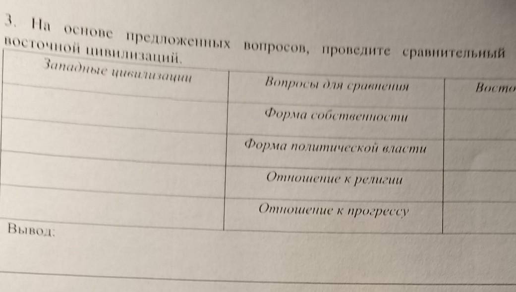 3. На основе предложенных вопросов, проведите сравнительный анализ западной и восточной цивилизаций. Западные цивилизации Восточные цивилизации Вывод: Вопросы для сравнения Форма собственности Форма политической власти Отношение к религии Отношение к прогрессу