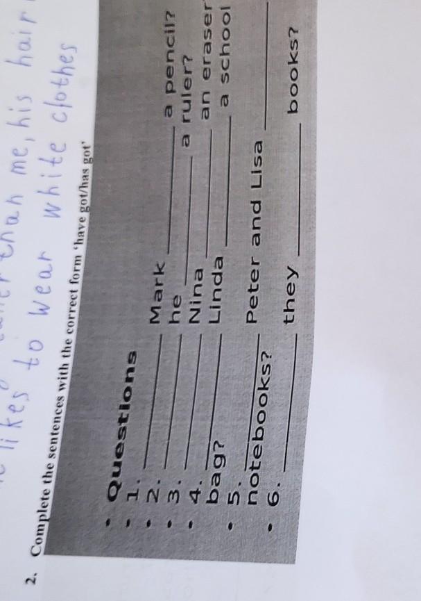 and he likes to wear white clothes. grig taller than me, his hair is 2. Complete the sentences with the correct form 'have got/has got' • Questions 1. 2. 3. 4. bag? 5. notebooks? 6. Mark he Nina Linda a pencil? a ruler? Peter and Lisa they an eraser? a school books?