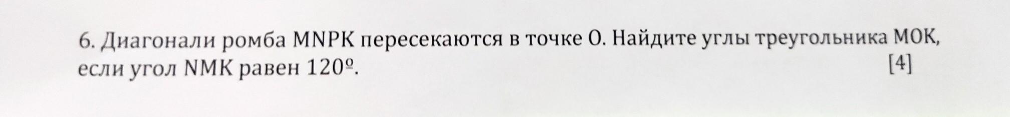 6. Диагонали ромба MNPK пересекаются в точке О. Найдите углы треугольника МОК, [4] если угол NMK равен 120 градусов ПОМОГИТЕ СОЧ ПО ГЕОМЕТРИИ