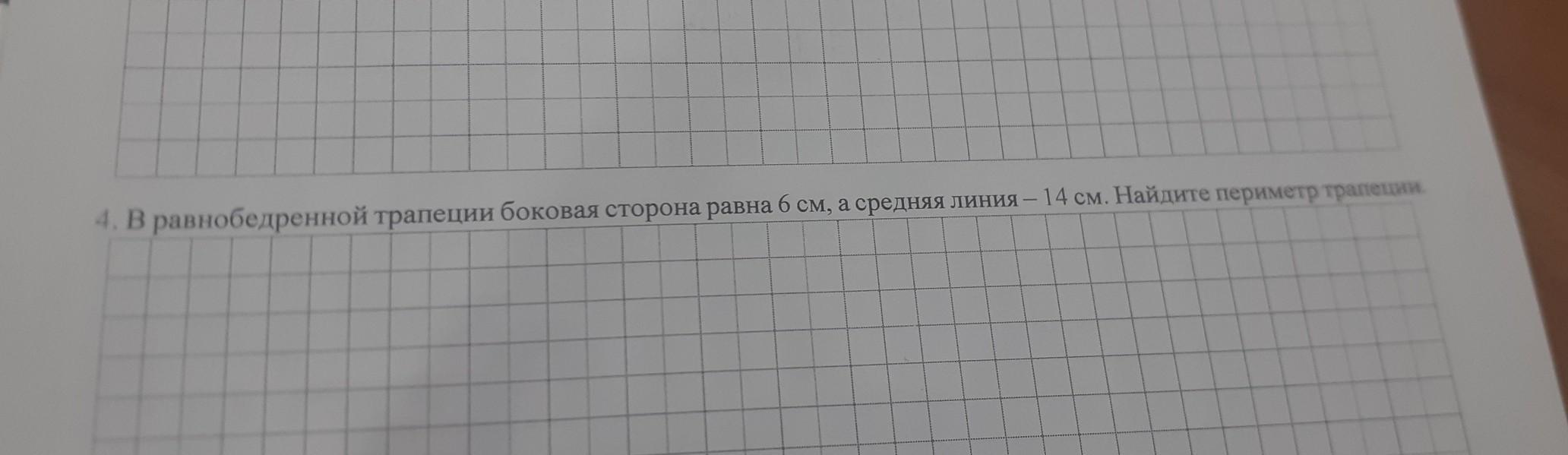 4. В равнобедренной трапеции боковая сторона равна 6 см, а средняя линия - 14 см. Найдите периметр трапеции