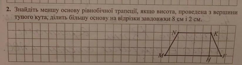 2. Знайдіть меншу основу рівнобічноï трапеції, якщо висота, проведена з вершини тупого кута, длить більшу основу на вiдрiзки завдовжки 8 см і 2 см