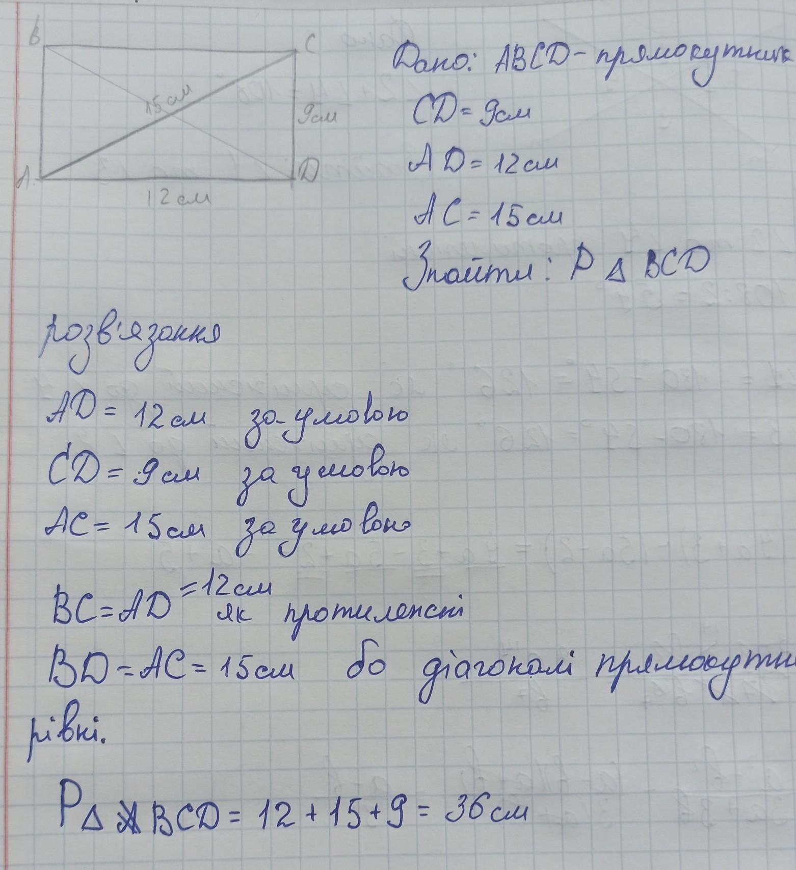 3. В прямокутнику ABCD AD дорівнює 12 см, CD дорівнює 9 см, а діагональ АС дорівнює 15 см. Знайти периметр трикутника BCD.
