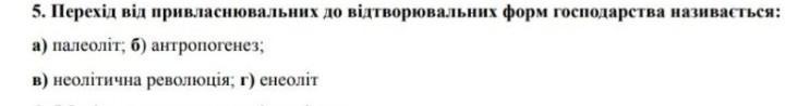 5. Перехід від привласнювальних до відтворювальних форм господарства називається: а) палеоліт; б) антропогенез; в) неолітична революція; г) енеоліт