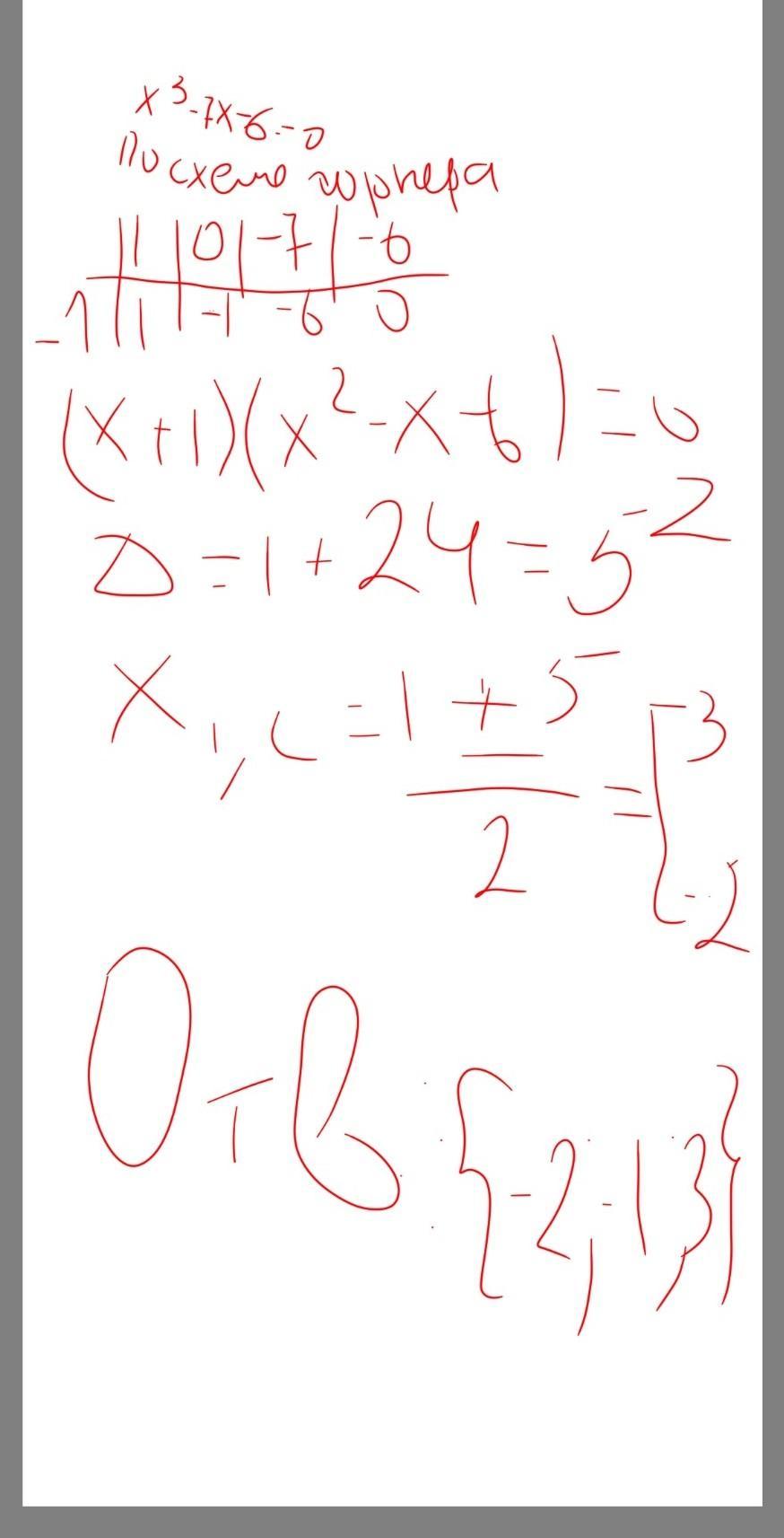 далее начинаем делить по схеме Горнера (проверять подходят ли корни и видим что -1 подходит. Далее можно либо решить квадратное уравнение либо продолжить по схеме Горнера я решил квадратное уравнение. надеюсь помог