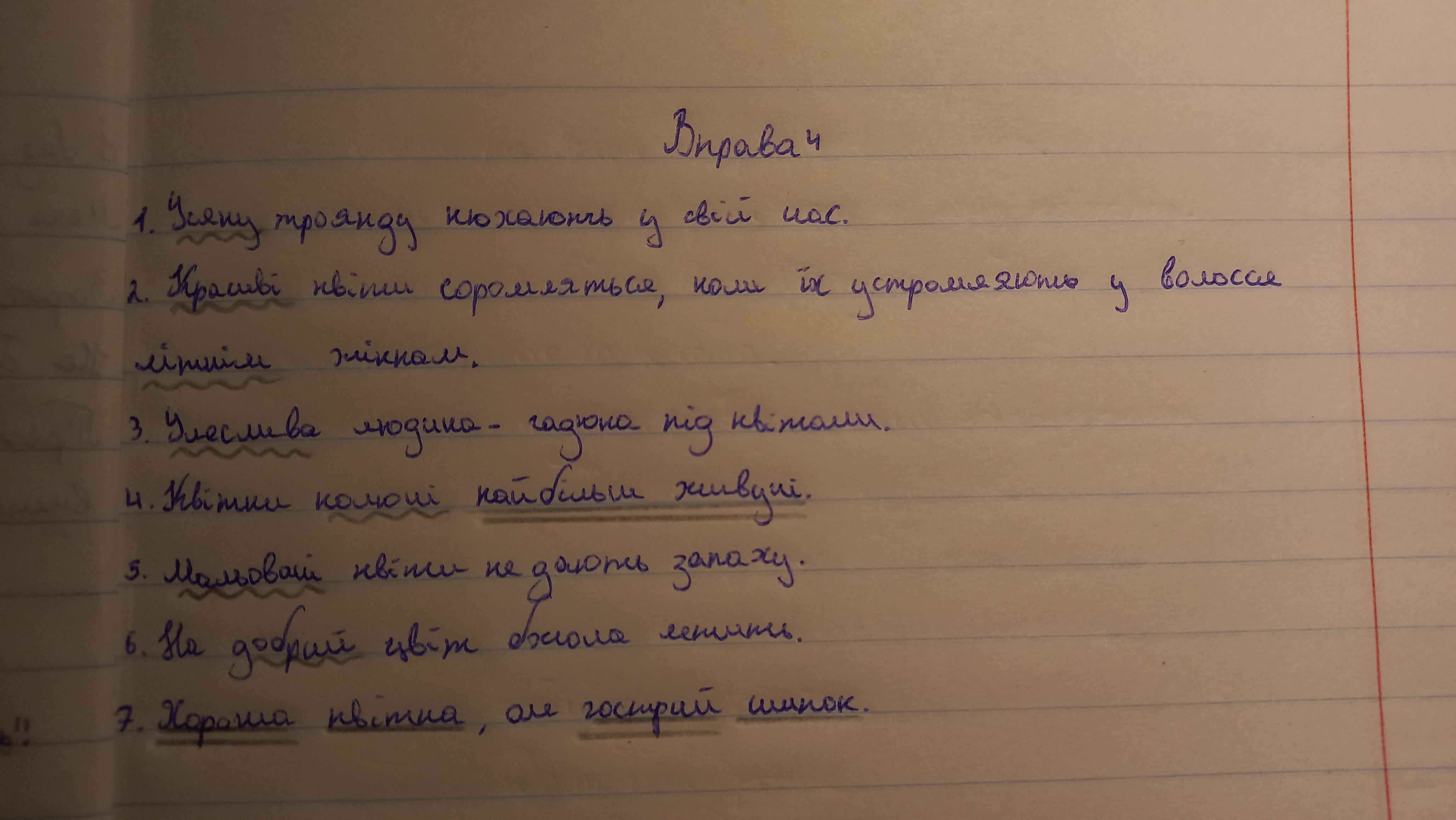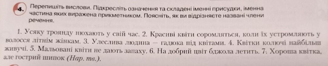 4. Перепишіть вислови. Підкресліть означення та складенi iменні присудки, іменна частина яких виражена прикметником. Поясніть, як ви відрізняєте названі члени речення. колючi найбільш 1. Усяку троянду нюхають у свій час. 2. Красиві квіти соромляться, коли їх устромляють у волосся літнім жінкам. 3. Улеслива людина -гадюка під квітами. 4. Квітки живучі. 5. Мальовані квіти не дають запаху. 6. На добрий цвіт бджола летить. 7. Хороша квітка, але гострий шипок (Нар. тв.).