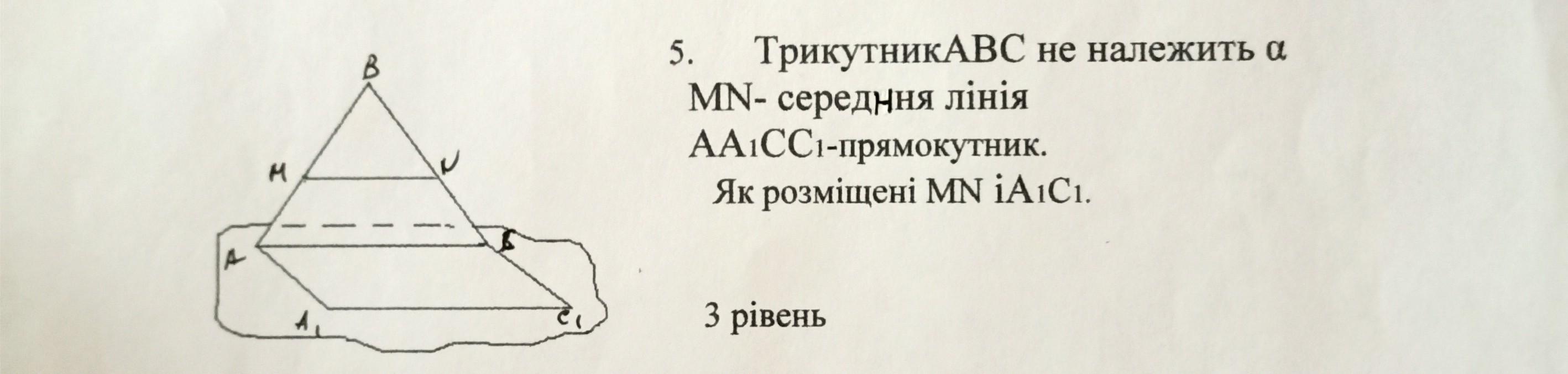 Сочно дам 25 б ТрикутникАВС не належить а МN-середня лінія АА СС промокутник. Як розміщені MN iA1C1.