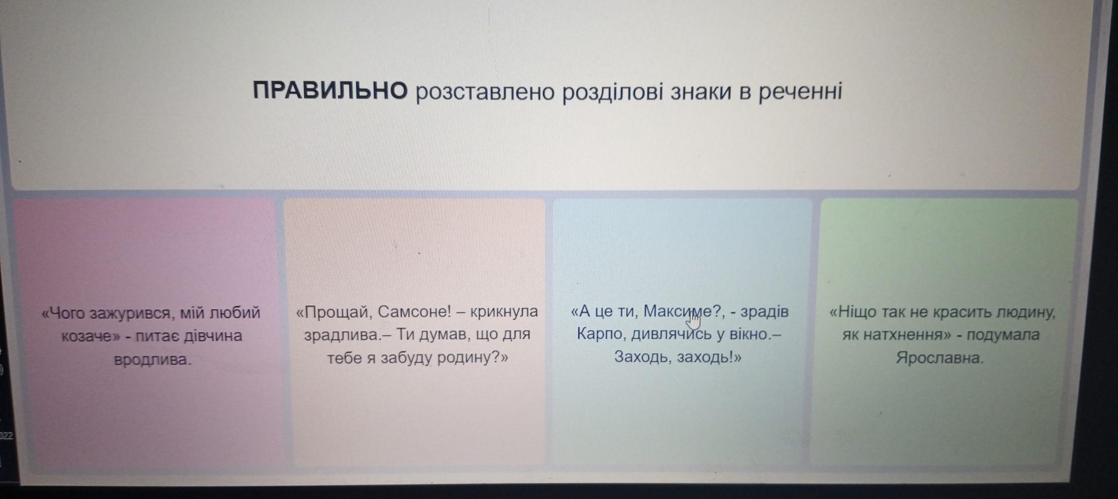 ПРАВИЛЬНО розставлено розділові знаки в реченніА) «Чого зажурився, мій любий - питає дівчина вродлива. козаче>>Б) «Прощай, Самсоне! - крикнула зрадлива.- Ти думав, що для тебе я забуду родину?»В) «А це ти, Максиме?, - зрадів Карпо, дивлячись у вікно.- Заходь, заходь!» г)«Ніщо так не красить людину, як натхнення» - подумала Ярославна.