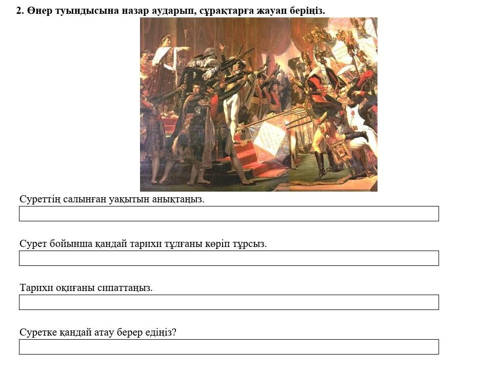 2. Өнер туындысына назар аударып, сұрақтарға жауап беріңіз. Суреттің салынған уақытын анықтаңыз. Сурет бойынша қандай тарихи тұлғаны көріп тұрсыз. Тарихи оқиғаны сипаттаңыз. Суретке кандай атау берер едiнiз?СРОЧНО КЕРЕК МАҒАН!