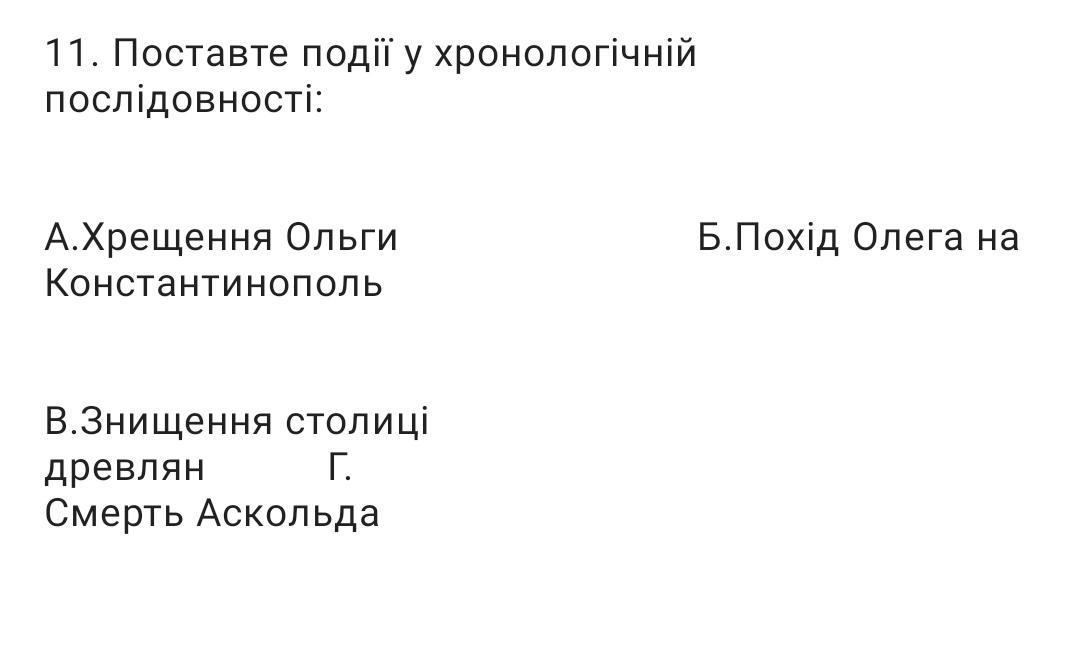 1-Г. Смерть Аскольда -> 2-Б. Похід Олега на Константинополь -> 3-В. Знищення столиці древлян -> 4-А. Хрещення Ольги