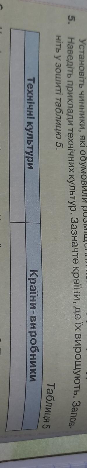 5. Наведіть приклади технічних культур. Зазначте країни, де їх вирощують. Заповніть у зошиті таблицю 5.