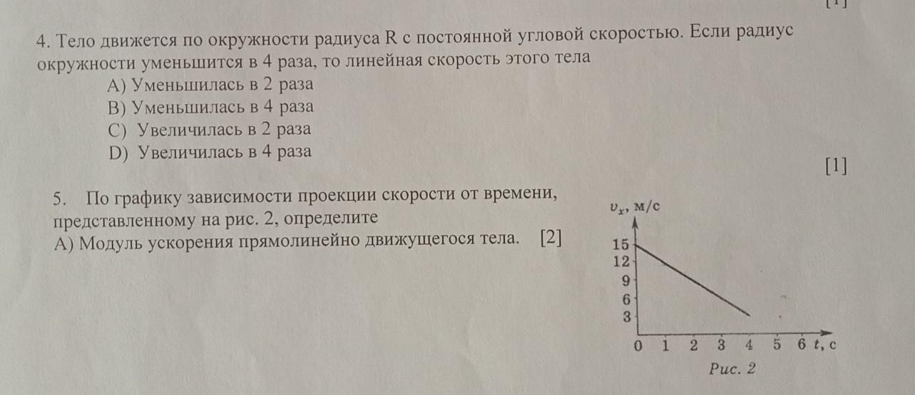 4. Тело движется по окружности радиуса R с постоянной угловой скоростью. Если радиус окружности уменьшится в 4 раза, то линейная скорость этого тела А) Уменьшилась в 2 раза В) Уменьшилась в 4 раза C) Увеличилась в 2 раза D) Увеличилась в 4 раза [1] [1]