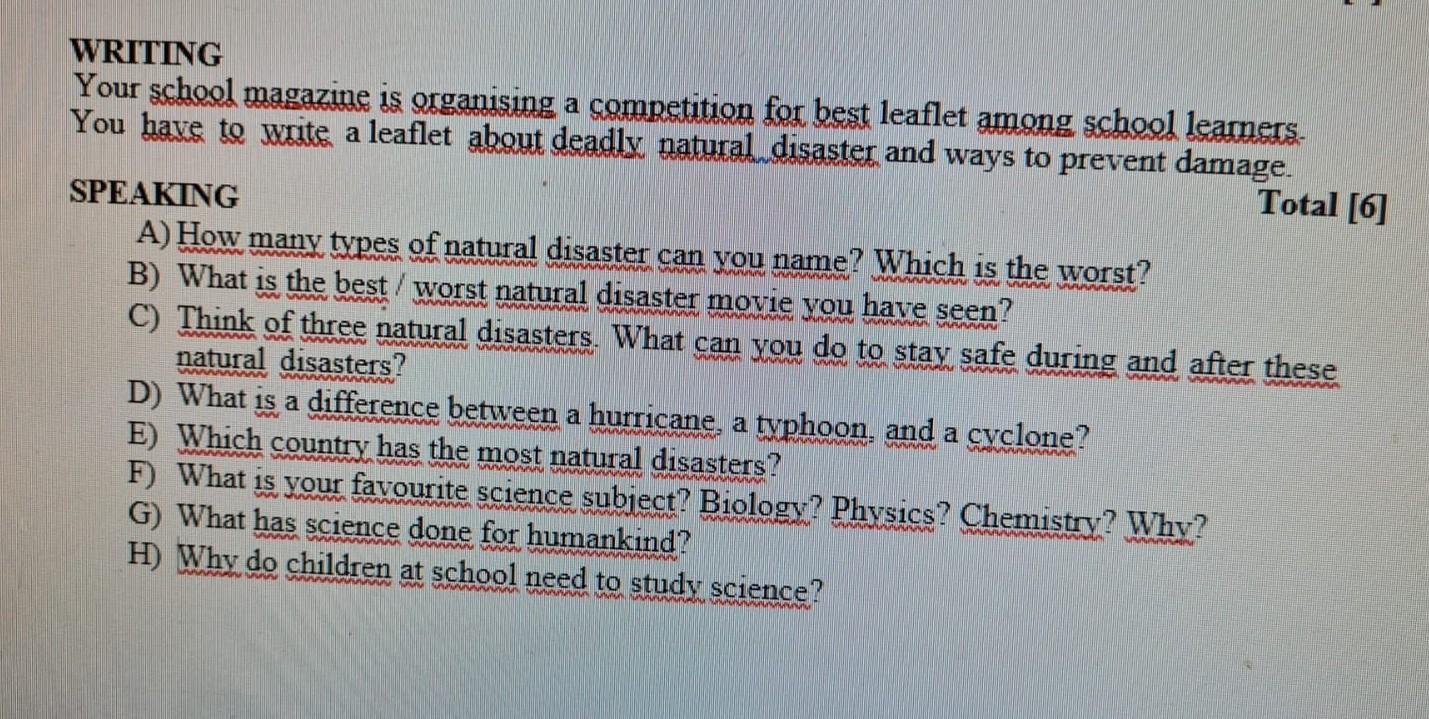 WRITING Your school magazine is organising a competition for best leaflet among school learners. You have to write a leaflet about deadly natural disaster and ways to prevent damage. SDE MO