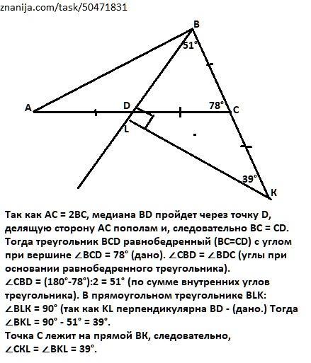 Дан треугольник АВС, где 2 ВС = АС и угол С = 78°. На луче ВС отложили отрезок СК = СВ. После чего из точки К провели перпендикуляр к прямой, содержащей медиану треугольника А ВС, проведённую из вершины В, и на пересечении получили точку L. Чему равен угол CKL? Ответ выразите в градусах.