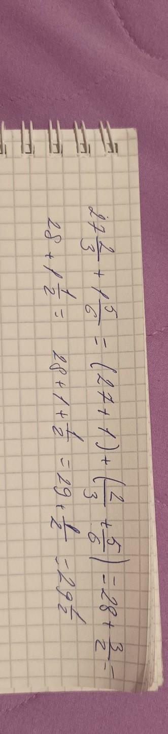 Ответ:27 2/3 + 1 5/6=28+ 2/3 + 5/6= 28+ 4+5/6=29 1/2