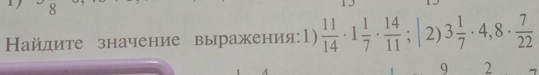 1)11/14*1¹/₇ * 4/11=(11*(7+1)*4)/(14*7*11)=32/84=8/21;