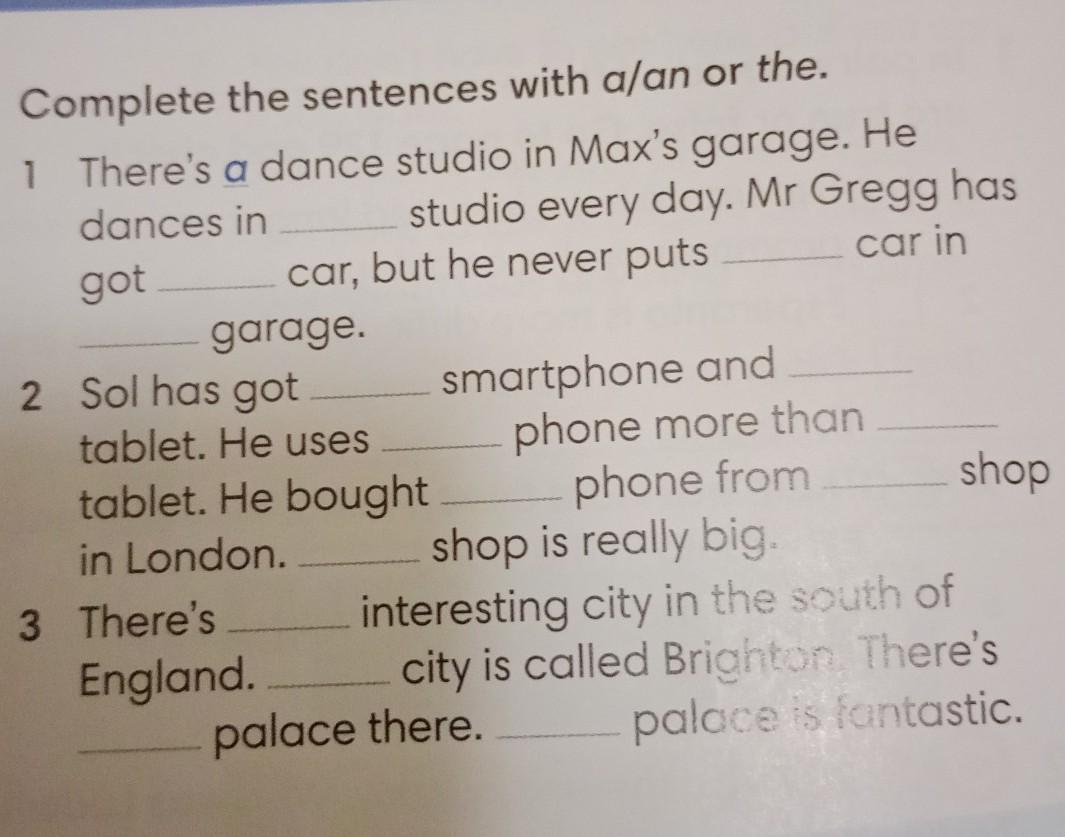 4 Complete the sentences with a/an or the. 1 There's a dance studio in Max's garage. He studio every day. Mr Gregg has dances in got car, but he never puts car in garage. 2 Sol has got tablet. He uses tablet. He bought in London. 3 There's England. smartphone and phone more than phone from shop is really big. palace there. shop interesting city in the south of city is called Brighton. There's palace is fantastic.Срочно