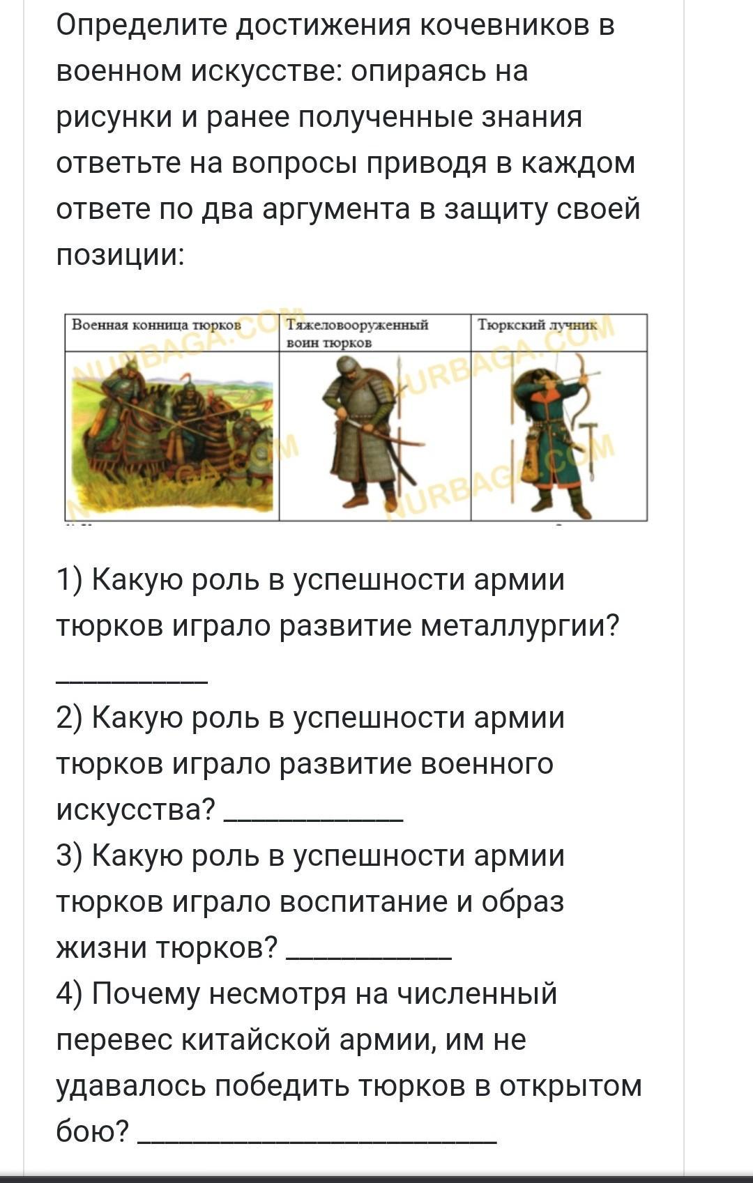 1) Какую роль в успешности армии тюрков играло развитие металлургии? ___________ 2) Какую роль в успешности армии тюрков играло развитие военного искусства? _____________ 3) Какую роль в успешности армии тюрков играло воспитание и образ жизни тюрков? ____________ 4) Почему несмотря на численный перевес китайской армии, им не удавалось победить тюрков в открытом бою. простыми словами