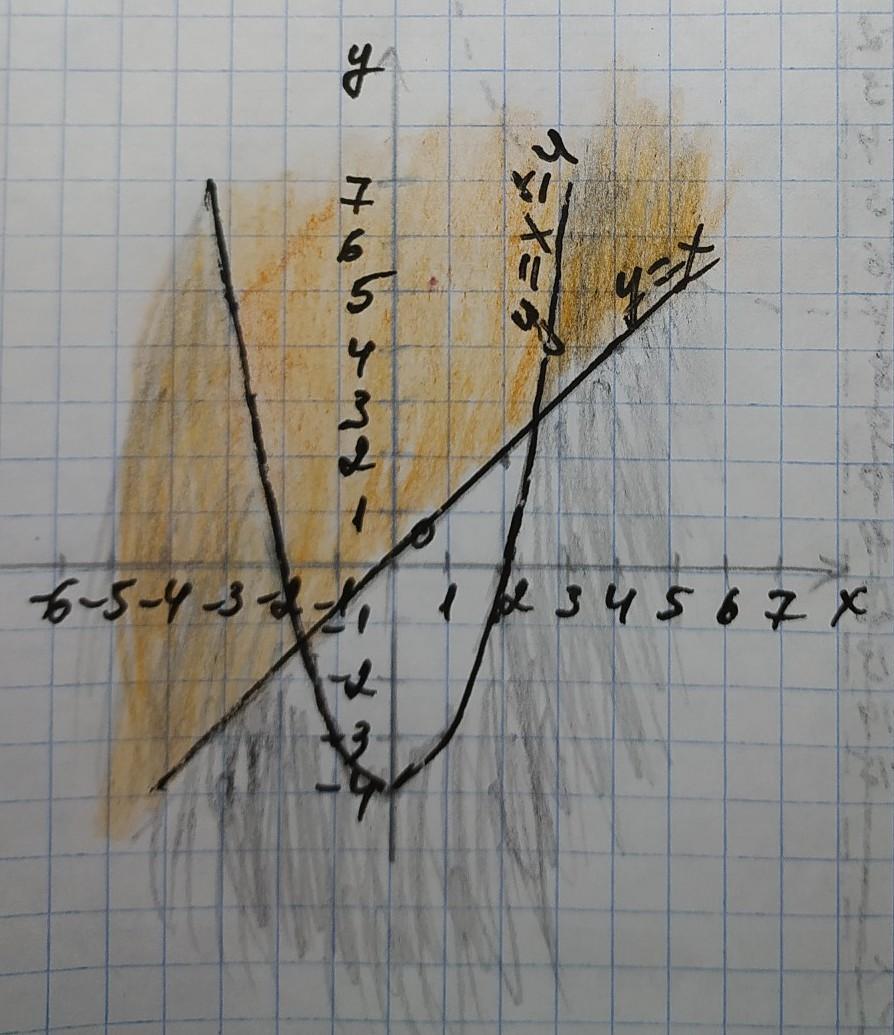 Возьмём любую координату, например (2; 2) при этом у ≥ 2, значит закрашиваем ту область, которая находится над этим графиком оранжевым цветом и она будет означать множество точек неравенства