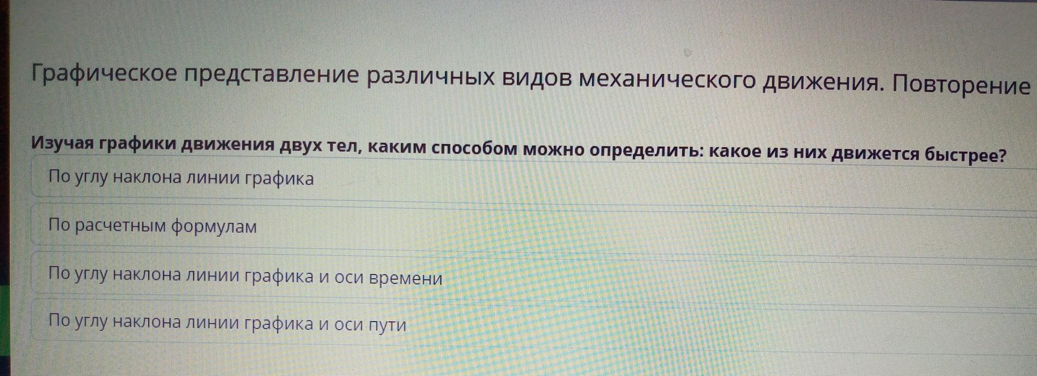 Изучая графики движения двух тел, каким способом можно определить: какое из них движется быстрее? по углу наклона линии графика ПО Расчетным формулам По углу наклона линии графика и оси времени По углу наклона линии графика и оси пути