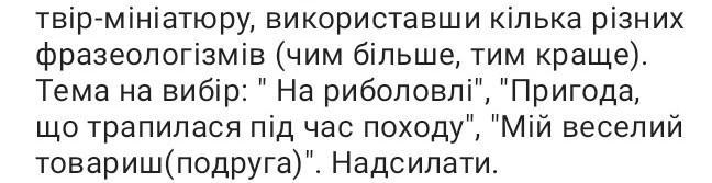 твір-мініатюру, використавши кілька різних фразеологізмів (чим більше, тим краще). Тема на вибір: " На риболовлі", "Пригода, що трапилася під час походу", "Мій веселий дам 35 балів срочно