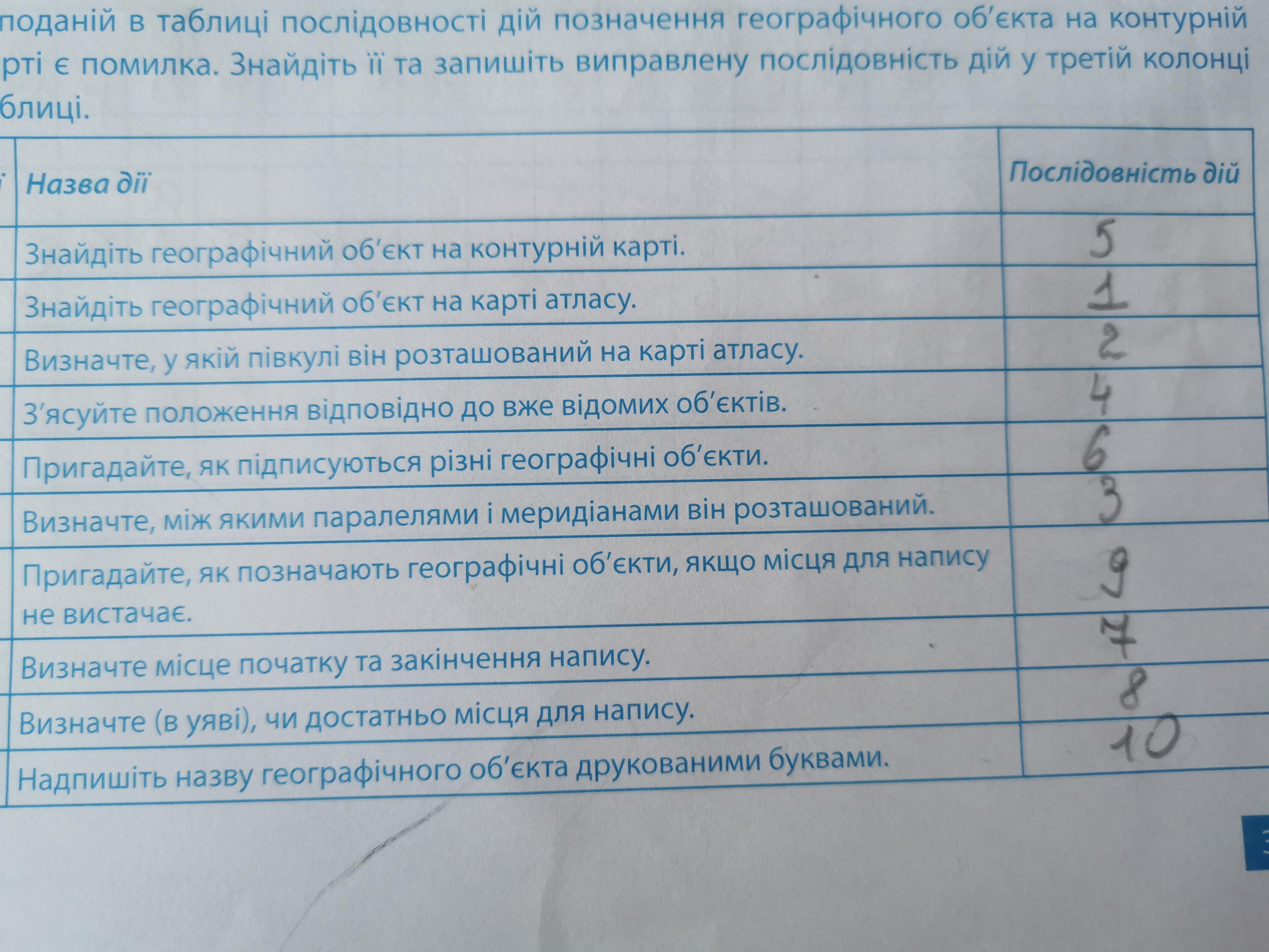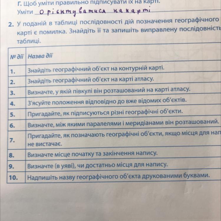 2. У поданій в таблиці послідовності дій позначення географічного об'єкта на контурній