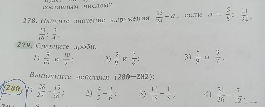 277. Произведе Будет ли сумма составным числом? 278. Найдите значение выражения 13 3 16 4 279. Сравните дроби: 28 19 58 ЭТИХ 9 10 и ; 1) 10 Выполните действия (280, 1) 29 2) 7 2) - из пр 4 1 5 6 - 23 -а, если а = 24 (280-282): 3) 11 15 3) 3 И 7 4) colc 31 36 11 24 7 12