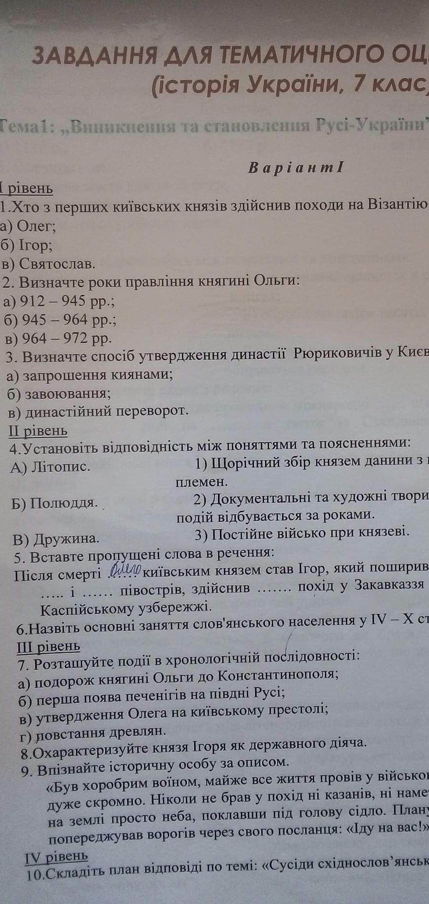 Temal: Виникнення та становления Рус B a pia u m I I рівень В 1.Хто з перших київських князів здійснив походи на Візантію в 907 а) Олег; б) Ігор; в) Святослав. 2. Визначте роки правління княгині Ольги: a) 912 - 945 pp.; б) 945 - 964 pp.; B) 964 - 972 pp. 3. Визначте спосіб утвердження династії Рюриковичів у Києві: а) запрошення киянами; б) завоювання; в) династійний переворот. II рівень 4. Установіть відповідність між поняттями та поясненнями: А) Літопис. Б) Полюддя. В) Дружина. 3) Постійне військо при князеві. 5. Вставте пропущені слова в речення: Після смерті ..... i ...... півострів, здійснив Каспійському узбережжі. 6.Назвіть основні заняття слов'янського населення у IV - X ст. III рівень 7. Розташуйте події в хронологічній послідовності: a) подорож княгині Ольги до Константинополя; б) перша поява печенігів на півдні русi; в) утвердження Олега на київському престолі; г) повстання древлян. 1) Щорічний збiр князем данини з підлег племен. 2) Документальні та художні твори, в яки подій відбувається за роками. київським князем став Ігор, який поширив свою похід у Закавказзя і 8.Охарактеризуйте князя Ігоря як державного діяча. 9. Впізнайте історичну особу за описом. о Срочно даю 30 балов