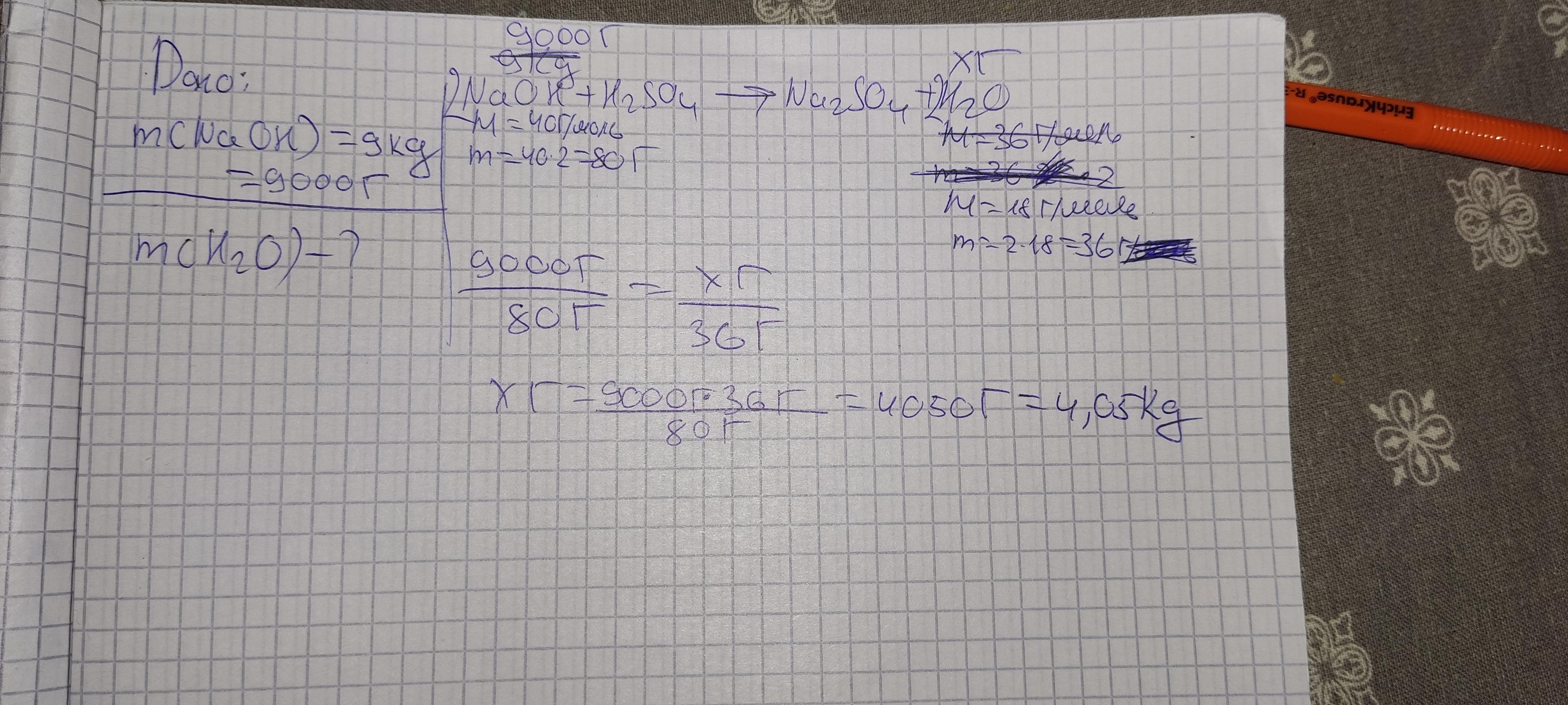 Какова будет масса воды, если 9 кг едкого натра прореагируют с серной кислотой?