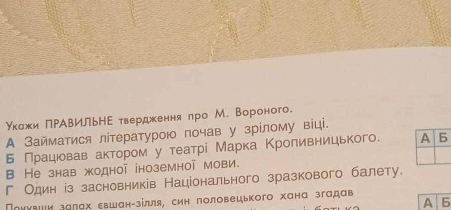 Укажи ПРАВИЛЬНЕ твердження про М. Вороного. А займатися літературою почав у зрілому віці. Б Працював актором у театрі Марка Кропивницького. В Не знав жодної іноземної мови. Г Один із засновників Національного зразкового балету. А Б В