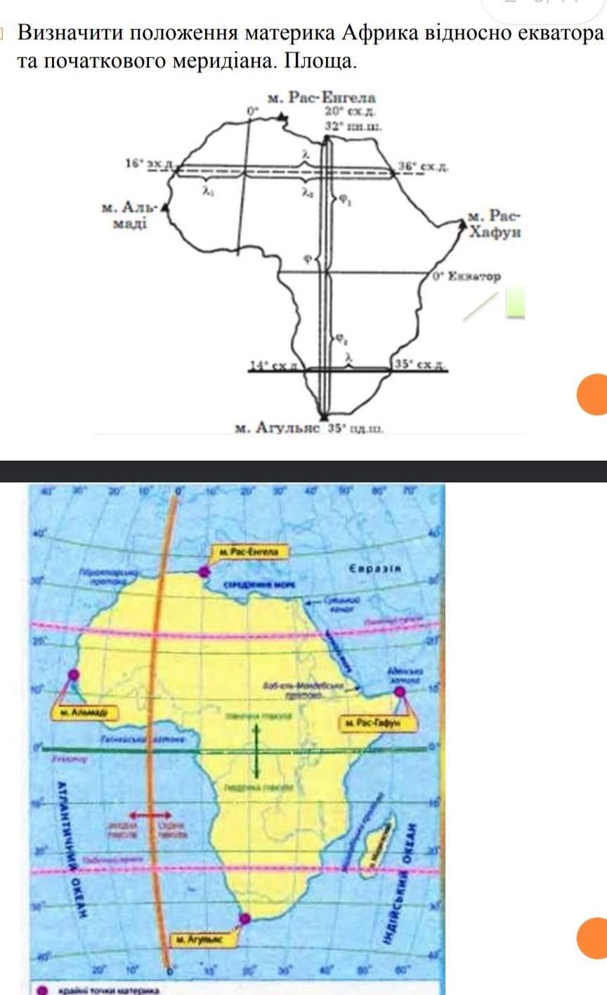 Визначити положення материка Африки відносно екватора та початкового меридіана. Площа.