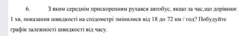 З яким середнім прискоренням рухався автобус, якщо за час, зо дорівнює 1 хв, показания швидкості на спідометрі змінилися від 18 до 72 км / год? Побудуйте графік залежності швидкості від часу