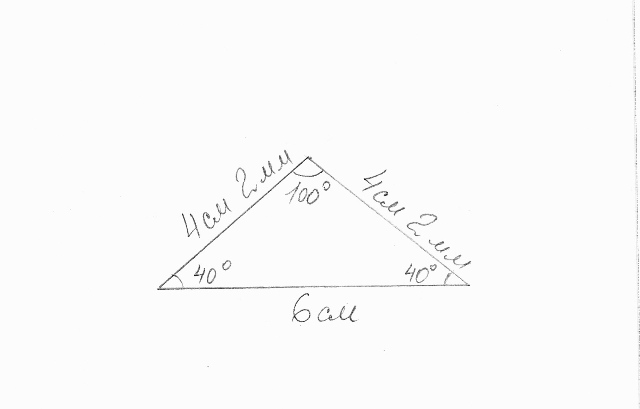 начерти равнобедренный треугольник и измерь неизвестные углы и стороны,если: основание равно 6 см,а угол при основании- 40 градусов.