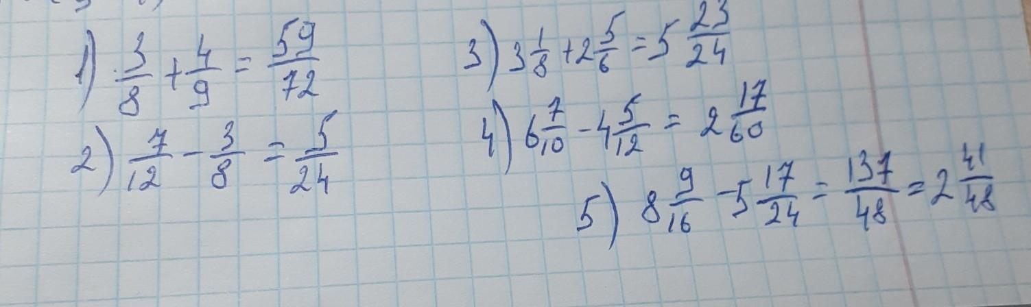 Відповідь:1)59/72 2)5/24 3)5целих 23/24 4)2целих 17/60 5)137/48