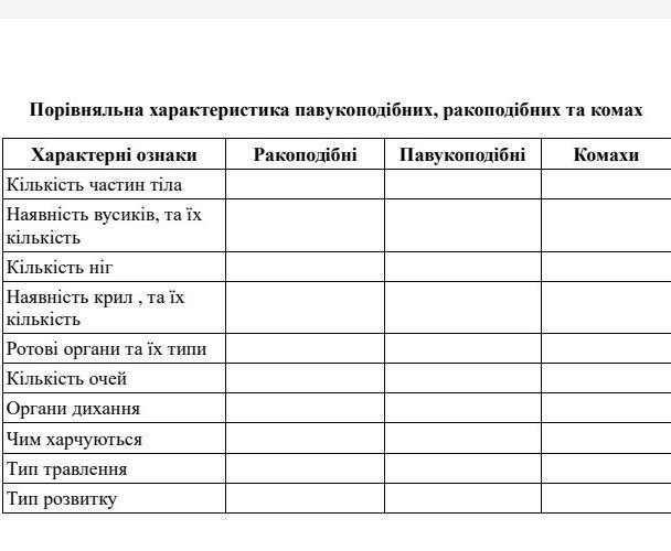 Объяснение:ВІДМІННІ ОЗНАКИКЛАС РАКОПОДІБНІ (Crustaceae)КЛАС ПАВУКОПОДІБНІ (Arachnida) КЛАС КОМАХИ (Insecta)1Кількість видівПонад 20 000Понад 36 0001 500 0002Розміри тілаВід часток мм (галузестовусі, веслоногі) до 3 м (краб макрохейра)Від 0,2 мм (кліщі) до 20 см (скорпіони, павуки-птахоїди)Від 0,21 мм (наїзник-яйцеїд алаптус) до 30 см (метелик орнітоптера)3Відділи тілаГоловогруди,черевцеГоловогруди, черевце (у кліщів часто всі відділи злиті)Голова, груди, черевце4Кількість вусиківДві пари (4): антени та антенулиВідсутніОдна пара (2): антени або сяжки5Кількість ротових кінцівокТри пари (6): верхні (1) і нижні (2) щелепиДві пари (4): верхні щелепи (1) і ногощупальця (1)Три пари (6): верхня і нижня щелепи, верхня і нижня губа6Кількість ходильних нігРізна (у десятиногих – п’ять пар)Чотири пари (8)Три пари (6)7КрилаВідсутніВідсутніДві пари (рідше одна пара або відсутні)8Ротовий аппаратГризучийСмоктальнийРізноманітний9Травна системаРот, глотка, стравохід, шлунок – жувальний і цідильний (передній відділ); середня кишка з печінкою (середній відділ); задня кишка і анус (задній відділ)Рот, глотка, стравохід, смоктальний шлунок і шлунок зі сліпими виростами (передній відділ); середня кишка з печінкою (середня відділ); задня кишка і анус (задній відділ)Рот, глотка, стравохід, воло, жувальний шлунок (передній відділ); середня кишка без печінки (середній відділ); задня кишка і анус (задній відділ)10Органи диханняЗябраЛегеневі мішки і трахеїТрахеї11Кровоносна системаСерце п’ятикутне 3 клапанами; є артерії, вени і капіляриСерце трубчасте, є артерії, гемолімфа безколірнаНе зв’язана з дихальною системою; серце трубчасте з короткою аортою12Видільна системаПара зелених залоз (видозмінені метанефридії)Мальпігієві судиниМальпігієві судини і жирове тіло13Нервова системаНадглотковий, під-глотковий вузли 3 нервовим кільцем і черевний нервовий ланцюжокГоловогрудний вузол (злиття 5 пар нервових вузлів) і черевний нервовий ланцюжокБільший надглотковий, підглотковий вузли 3 нервовим кільцем і черевний нервовий ланцюжок14Органи чуттівОдна пара складних очей, органи нюху на антенулах, органи дотику на антенах, органи рівноваги в основі антенулОдна – чотири пари простих очей, органи дотику на ногощупальцях,органи хімічного чуття в щілинах кутикулиОдна пара складних очей, органи нюху на вусиках, органи дотику і смаку на ротових придатках