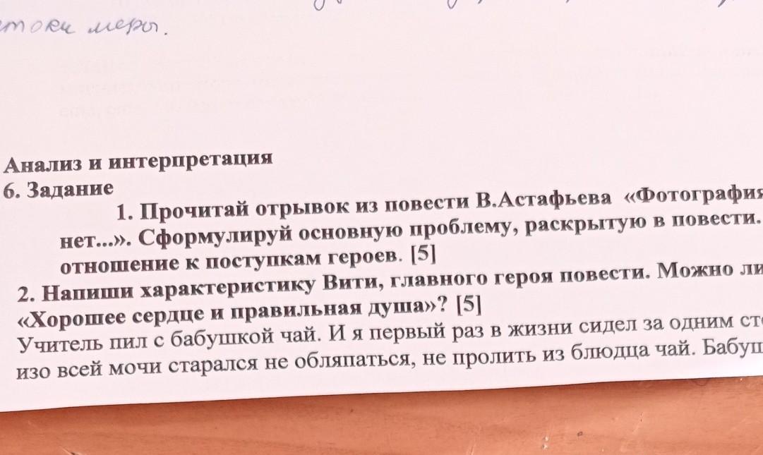 Анализ и интерпретация 6. Задание 1. Прочитай отрывок из повести В.Астафьева «Фотография, на которой меня нет...». Сформулируй основную проблему, раскрытую в повести. Выскажи своё отношение к поступкам героев. [5] 2. Напиши характеристику Вити, главного героя повести. Можно ли сказать о нём: «Хорошее сердце и правильная душа»? [5] Учитель пил с бабушкой чай. И я первый раз в жизни сидел за одним столом с учителем и изо всей мочи старался не обляпаться, не пролить из блюдца чай. Бабушка застелила стол