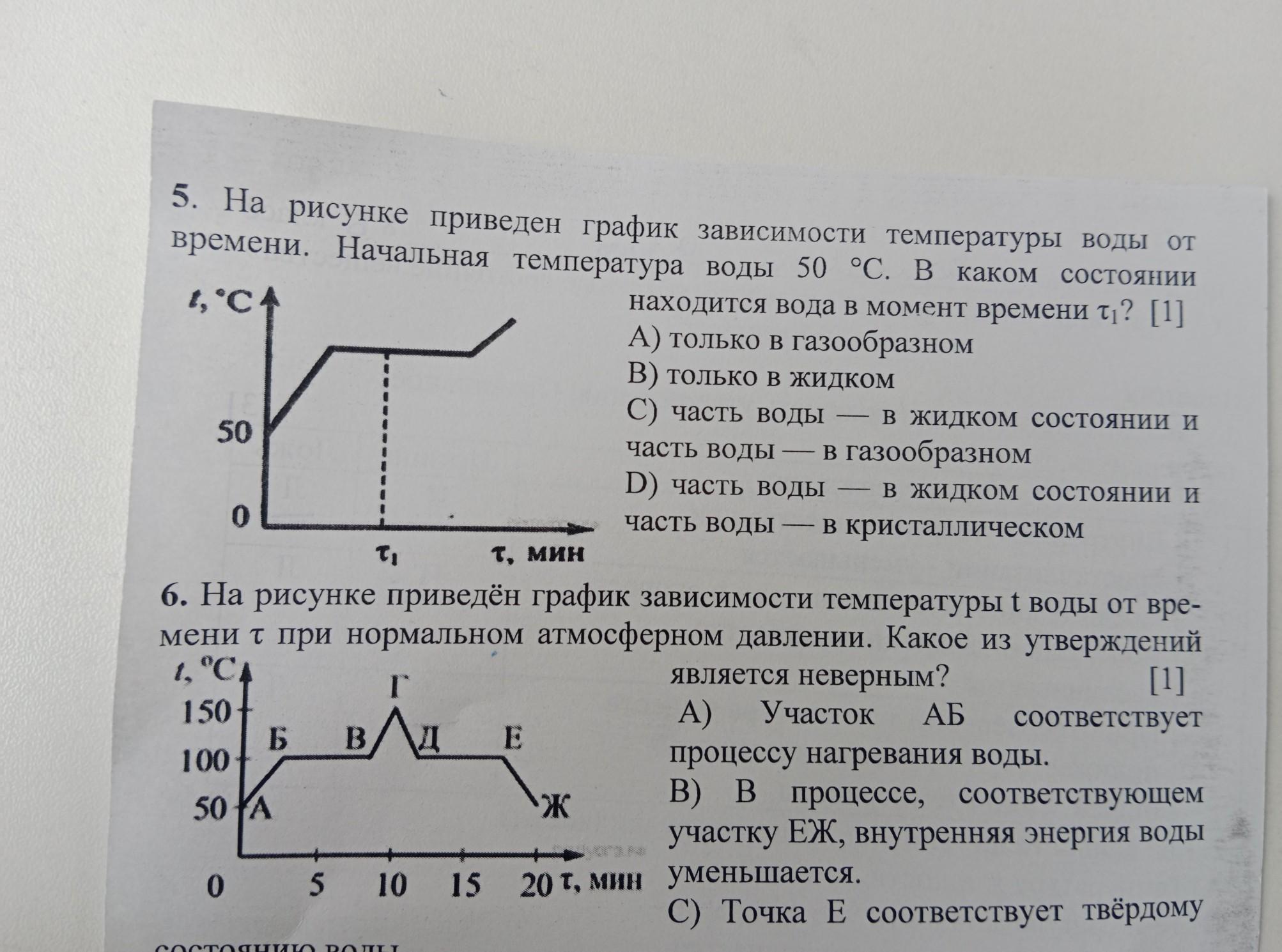 На рисунке приведён график зависимости температуры t воды от вре- ени т при нормальном атмосферном давлении. Какое из утверждений "C является неверным? [1] A) Участок АБ соответствует 150 процессу нагревания воды. B) В B r в д Б B 100 50 YA E Ж процессе, соответствующем участку ЕЖ, внутренняя энергия воды 20 г, мин уменьшается.