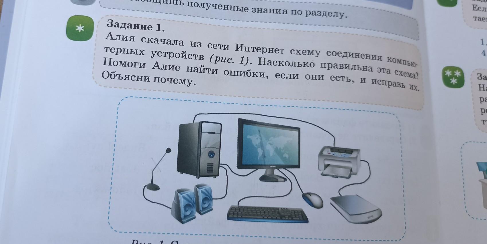 * Задание 1. Алия скачала из сети Интернет схему соединения компью- терных устройств (рис. 1). Насколько правильна эта схема? Помоги Алие найти ошибки, если они есть, и исправь их. Объясни почему. М Рис. 1. Соединение компьютерных устройств *