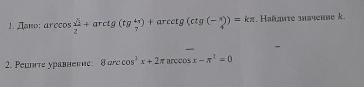 π/6-arctg(tg(3π/7))+arcctg(-ctg(π/4))=πk