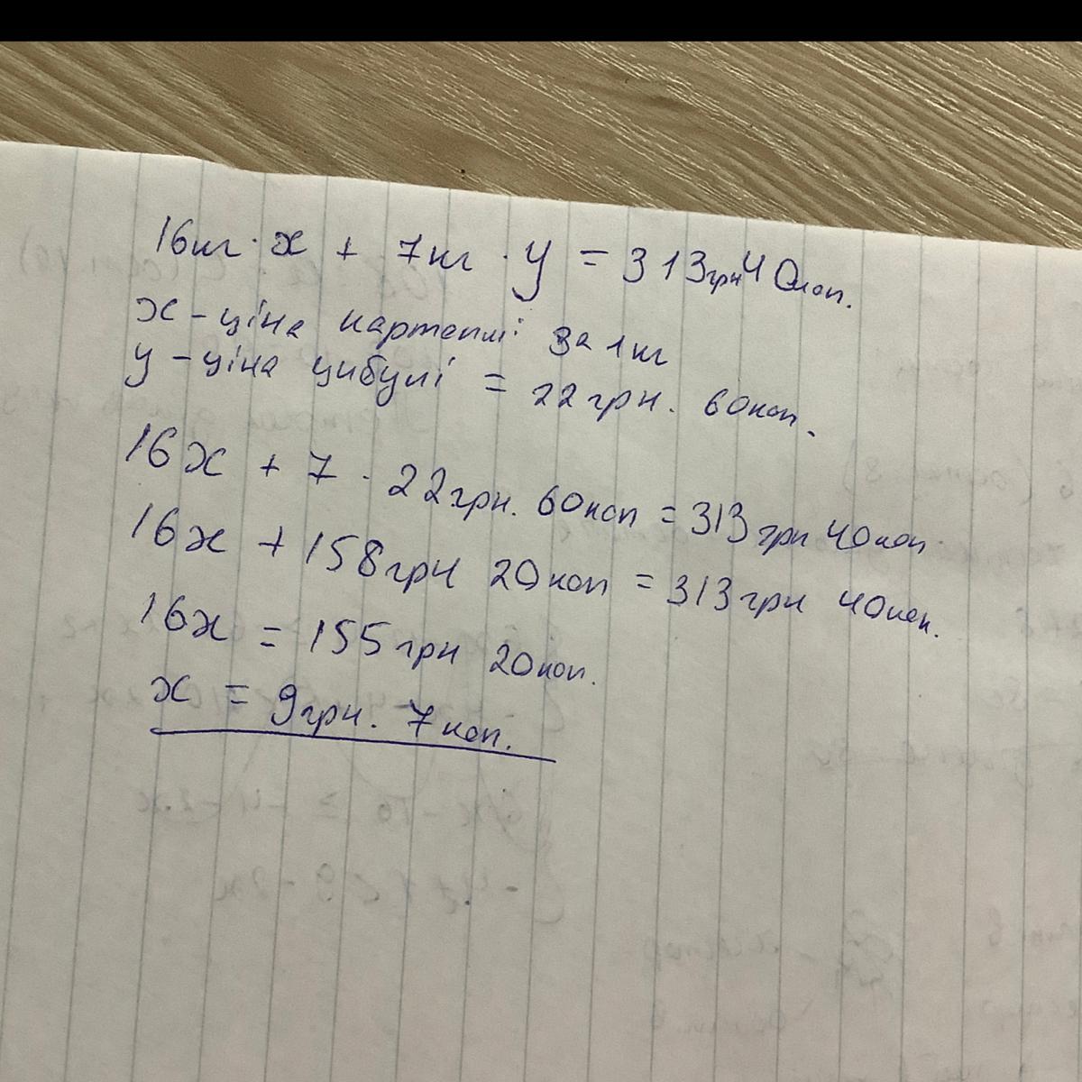 Купили 16 кг картоплі і 7 кг цибулі, заплативши за всю покупку 313 грн. 40 коп. Скільки коштує 1 кг картоплі, якщо ціна 1 кг цибулі дорівнює 22 грн. 60 коп.?