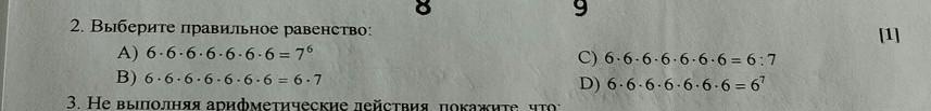 2. Выберите правильное равенство: A) 6-6-6-6-6-6-6=76 B) 6-6-6-6-6-6-6-6-7 3. Не выполняя арифметические действия, покажите что 9 C) 6-6-6-6-6-6-6=6:7 D) 6-6-6-6-6-6-6-67