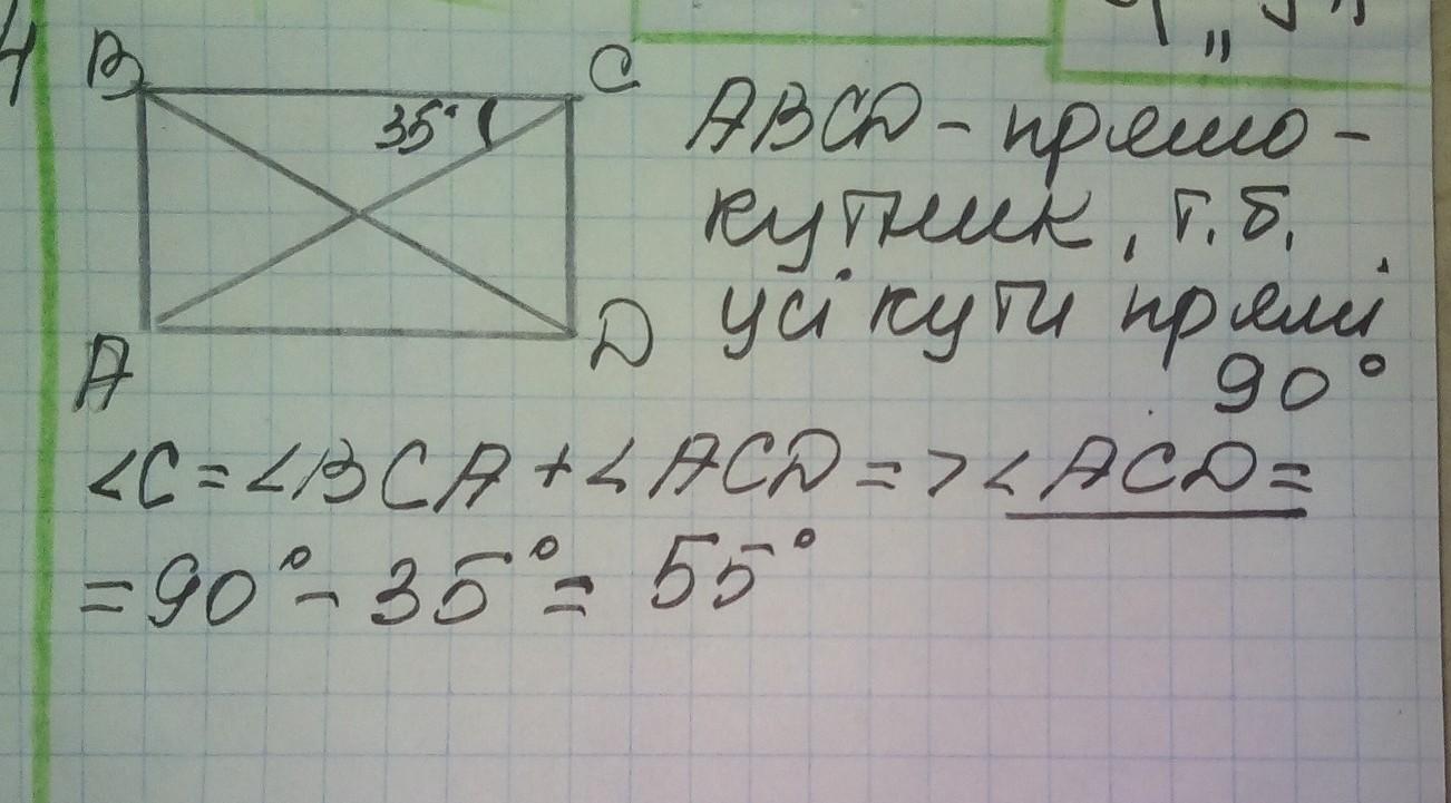 У прямокутнику ABCD кут BCA дорівнює 35 градусів. Знайдіть градусну міру кута ACD .