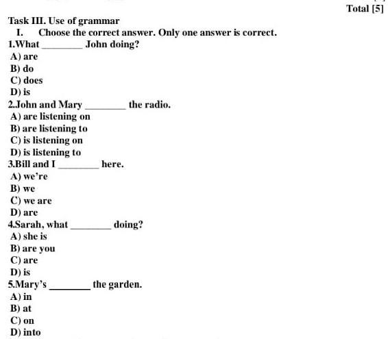 Choose the correct answer. Only one answer is correct. John doing? I. 1.What A) are B) do C) does D) is 2.John and Mary A) are listening on B) are listening to C) is listening on D) is listening to 3.Bill and I A) we're B) we C) we are D) are 4.Sarah, what A) she is B) are you C) are D) is 5.Mary's A) in B) at C) on D) into on here. the radio. doing? the garden.