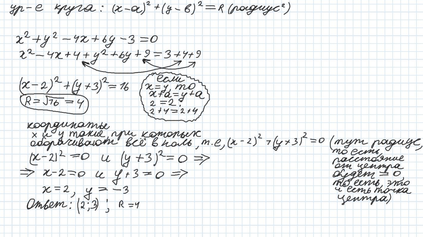Найти кординаты центра и радиус круга заданого уровнением X^2 + y^2- 4x + 6y-3=0