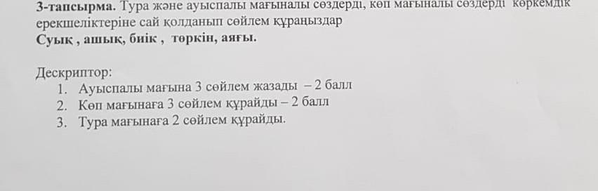 3-тапсырма. Тура және ауыспалы мағыналы сөздерді, көп мағыналы сөздердi көркемд ерекшеліктеріне сай колданып сөйлем құраныздар Суык, ашық, биік, төркін, аяғы. Дескриптор: 1. Ауыспалы мағына 3 сейлем жазады - 2 балл 2. Көп мағынаға 3 сөйлем құрайды - 2 балл 3. Тура мағынаға 2 сөйлем құрайды.