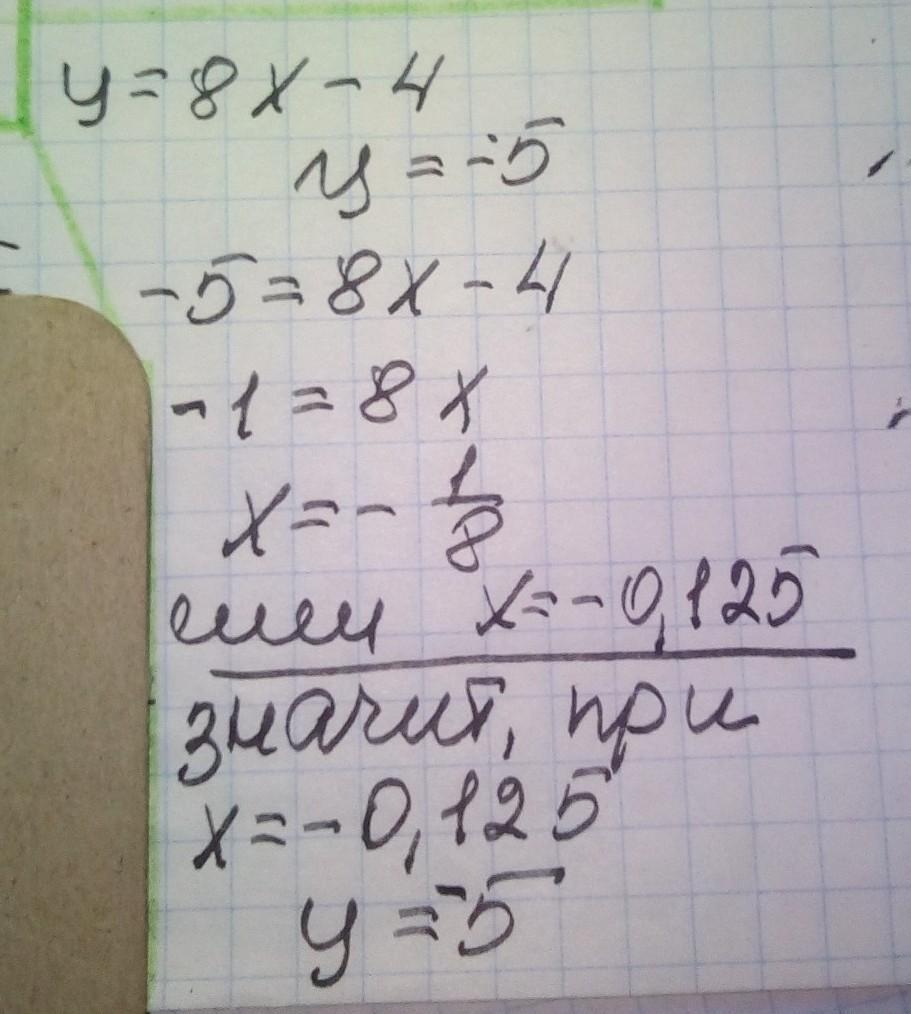 Найти значение х, при котором функция у = 8х – 4 принимает значение, равное -5.​