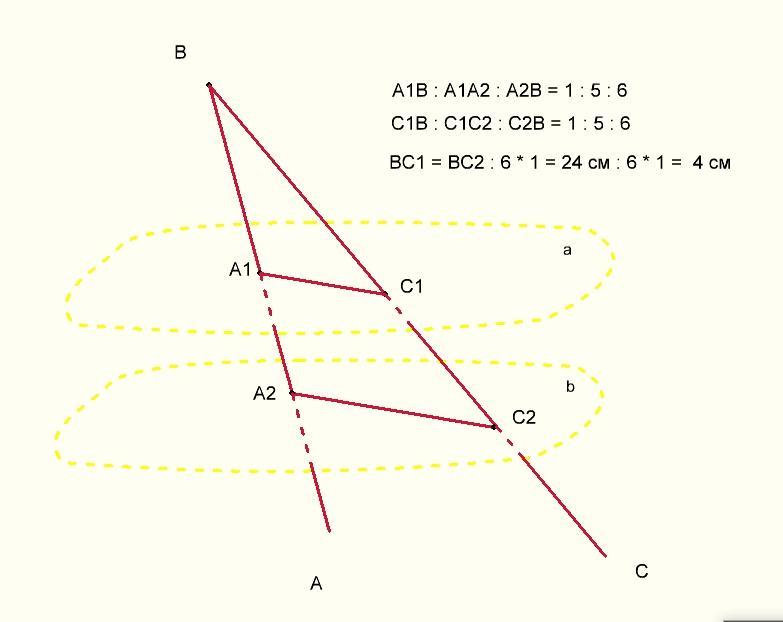 Площина α перетинає сторони кута ABC у точках A1 і C1 , а паралельна їй площина β у точках A2 і C2. Знайдіть довжину BC1, якщо A1B:A1A2=1:5, BC2=24 см