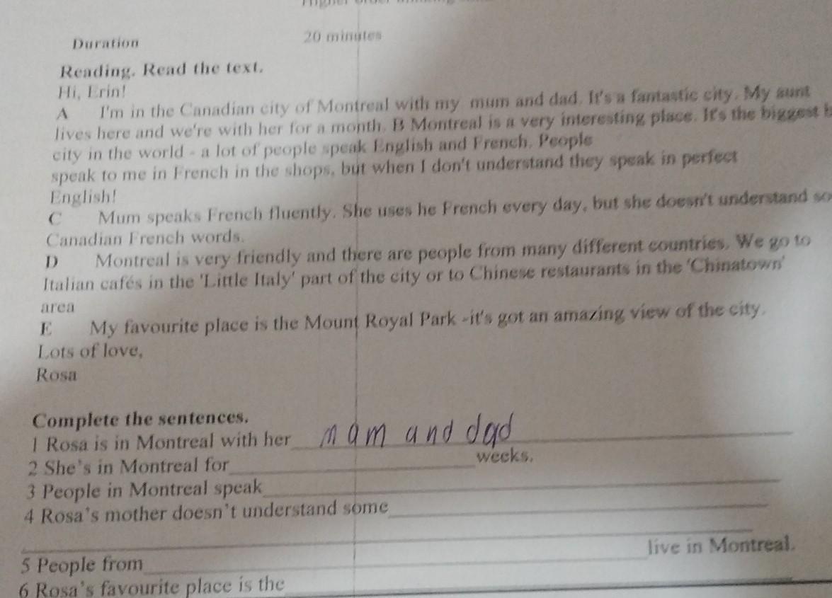 A I'm in the Canadian city of Montreal with my mum and dad. It's a fantastic city. My aunt lives here and we're with her for a month. B Montreal is a very interesting place. It's the biggest bilin city in the world - a lot of people speak English and French. People speak to me in French in the shops, but when I don't understand they speak in perfect English! C Mum speaks French fluently. She uses he French every day, but she doesn't understand some- Canadian French words. D Montreal is very friendly and there are people from many different countries. We go to Italian cafés in the 'Little Italy' part of the city or to Chinese restaurants in the 'Chinatown' area E My favourite place is the Mount Royal Park -it's got an amazing view of the city. Lots of love, Rosa Complete the sentences. 1 Rosa is in Montreal with her 2 She's in Montreal for 3 People in Montreal speak 4 Rosa's mother doesn't understand some 5 People from 6 Rosa's favourite place is the weeks. live in Montreal