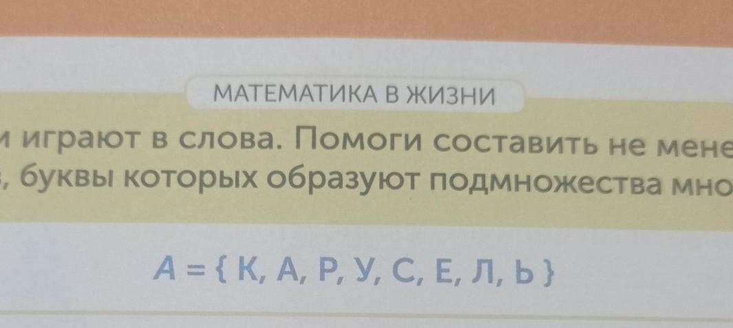 МАТЕМАТИКА В ЖИЗНИ Дети играют в слова. Помоги составить не менее пяти слов, буквы которых образуют подмножества множества A = { K, A, P, У, С, Е, Л, Ь}